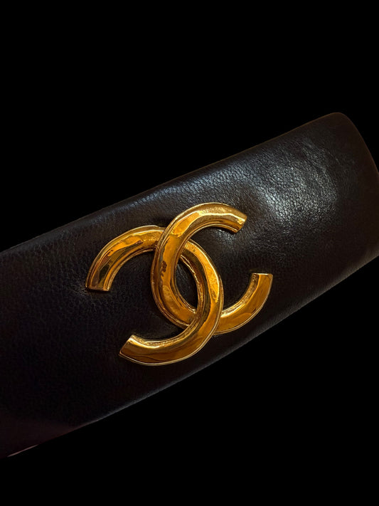 Chanel 80s Black Lambskin Leather Gold CC Long Barrette